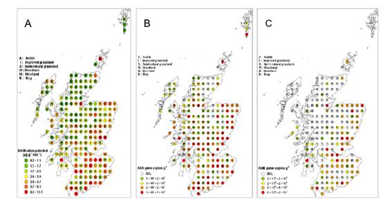 在土壤普查数据基础上,中科院城市环境研究所姚槐应等研究人员利用七百多个土壤样本,分析了国家区域尺度下氨氧化微生物群落的丰度和结构组成,借助典型变量分析、典范对应分析、多元回归分析等统计方法,深入分析了土地利用方式、土壤类型、土壤污染、气候和氮沉降等71种环境因子对氨氧化微生物群落的影响。结果表明,氨氧化微生物群落是受这些环境因子共同驱动的,如土壤中贝壳含量,氨态氮的沉积量等均能显著影响氨氧化微生物的多样性。研究结果还显示,特定氨氧化微生物种群的生境适应与硝化速率有关,最终会影响到其生态功能和服务。
