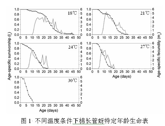 中国科学院新疆生态与地理研究所博士研究生高桂珍在吕昭智研究员指导下,测定了不同温度条件下(18-30℃)棉长管蚜的发育、存活和生殖。结果表明:棉长管蚜发育速率呈现先增长后下降的趋势,27℃时发育速率最快;若蚜存活率在18-27℃范围内均在80%以上,而30℃条件下仅为27%;产蚜量随着温度升高而降低,30℃时棉长管蚜不能生殖;棉长管蚜内禀增长率在27℃时最大。研究结果对于科学预测害虫种群发生发展、科学决策害虫防治措施具有重要意义。