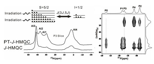 (左上)PT-J-HMQC原理示意图;(右)由PT-J-HMQC获得的二维31P-27Al J耦合异核相关谱;(左下)与传统J-HMQC方法获得二维相关谱的切片比较。