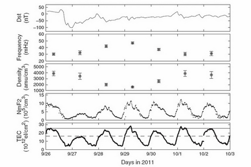 研究组从漠河地磁脉动观测数据中,反演出等离子体层在磁壳数L~2(大约1万3千公里)赤道处的等离子密度变化。同时,通过电离层的垂测仪,得到了电离层F2层(约200 - 400公里)电子密度峰值;并通过GPS-TEC监测仪,得到总电子含量。此外,统计分析子午工程2011年5个中等磁暴(-47nT < Dst < -103nT) 时,对电离层与等离子体层的同时观测数据结果表明,磁暴期间等离子体密度有20%到50%的密度减少,而且电离层密度的减少总是发生在等离子体密度减少之前(见图一)。初步分析认为,等离子体层的消减是由于电离层物质供给减少造成的,表明了磁暴期间电离层对等离子体层的物质调控作用。该项研究是子午工程综合监测参数用来研究地球空间不同圈层耦合作用的典型事例。