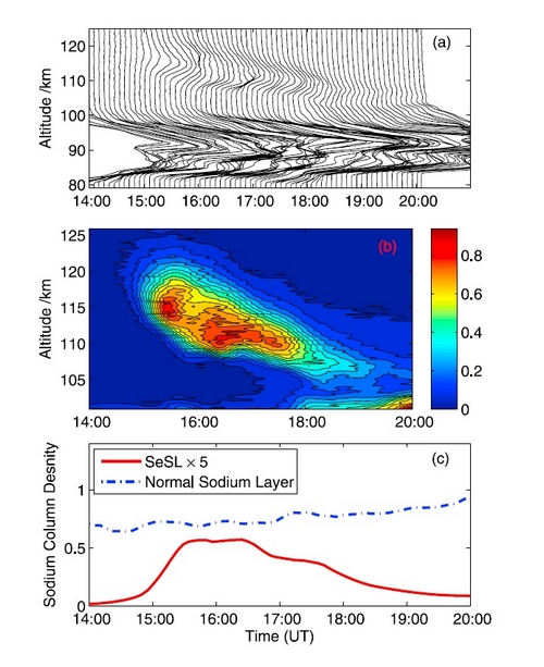 利用子午工程北京激光雷达,研究组在近两年的观测时间里,共发现有17次双钠层现象。该项研究发现不仅证实了双钠层这一特殊现象可以在不同纬度出现,同时,研究组从多次观测结果分析中获得了该现象的诸多特征信息,如时间空间的演化特征、发生频度的季节特征,以及与主钠层及其它钠层现象的关联等。该结果还将在一定程度上为进一步研究该现象的成因提供线索。