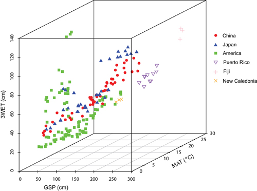 植物群落中叶片形态特征组合(以下简称叶相)与气候有着显著的相关性,这一规律被长期用于新生代植物群的古气候定量重建。统计一个化石植物群叶相的数据,就可以利用业已建立的叶相-气候模型定量重建该植物群的古气候。以往的研究表明,叶片面积和降雨量之间有着显著的相关性。