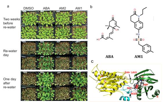 中科院上海生命科学研究院上海植物逆境生物学研究中心朱健康课题组、中科院上海药物研究所徐华强课题组和中科院广州生物医药与健康研究院许永研究员在最新的研究中,共同发现了脱落酸(Abscisic acid, ABA)受体激动剂AM1(ABA mimic 1)。AM1是一种具有脱落酸活性的小分子化合物,喷施于植物后可以降低叶片的失水速率,显著提高植物在干旱环境下的成活率,这一新发现为农业生产中的节水抗旱提供了新思路。7月9日,相关研究成果发表在国际学术期刊Cell Research上。