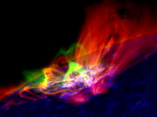 图: SDO卫星的多波段观测所展示的太阳耀斑结构