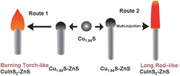 图1. 火炬状 (BTCIS–ZnS)和长棒状(LRCIS–ZnS) CuInS2–ZnS异质结的形成过程示意图