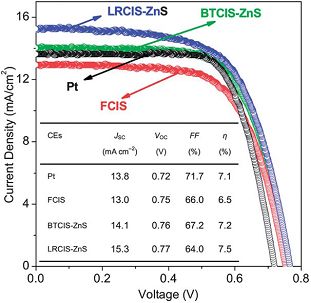 对电极是染料敏化太阳能电池的重要组成部分,目前通常采用贵金属Pt作为对电极。但是Pt储量稀少、价格高,极大限制了电池的大规模工业生产和商业化应用。因此寻找价格低、来源丰富的替代材料是亟待解决的关键问题之一。该论文以Cu1.94S-ZnS异质结构纳米晶为种子,在高温溶液中引入醋酸铟,最终合成了CuInS2-ZnS异质结构纳米材料。通过调节醋酸铟的加入方式和铟离子的浓度等,可以分别得到火炬状和长棒状的CuInS2-ZnS异质结。以其为对电极的染料敏化太阳能电池,光电转换效率可达7.5%,超过了传统的Pt电极电池。为高效低成本对电极的研发开辟了新路径。