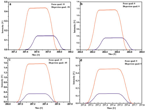 静态双接收309(Cs211BO2+)/308(Cs210BO2+)质量扫描图 (a: 采用L1和C杯并使用ZOOM功能;b和c:采用H3和H4杯,不使用和使用ZOOM功能;d: 特制Triton B,不使用ZOOM功能)