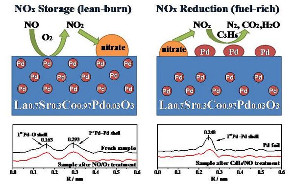 课题组利用上海光源BL14W1 XAFS线站表征了反应前后稀土钙钛矿催化剂中Pd元素的价态以及配位情况,发现Pd在稀燃(富氧)气氛中以离子态的形式存在于钙钛矿的晶格之中;而在富燃(贫氧)气氛中,则以金属态析出钙钛矿晶格,参与氮氧化物的催化消除。这说明离子态和金属态Pd能够在连续的“稀燃/富燃”脉冲气氛中“智能”的自我转化、再生,部分研究成果已发表于美国化学会ACS Catalysis期刊(ACS Catal. 2013, 3, 1071–1075)。