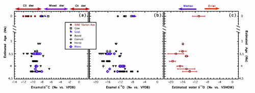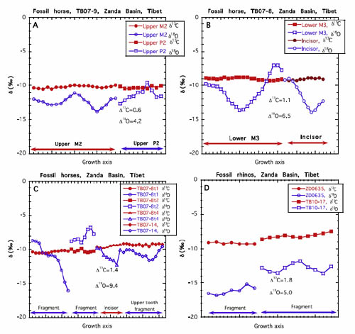 研究人员报道了对札达动物群以及该地区现生食草动物和水体的同位素分析,并据此推算了札达盆地的古气温。现代藏野驴以及家养的马、牛、羊的牙齿釉质样品的稳定碳同位素比值在−9.4±1.8‰的范围之内,指示这些动物的食物主要由本地的C3植物组成。另一方面,三趾马、披毛犀、鹿类和牛科动物化石的釉质碳同位素比值为−9.6±0.8‰,指示这些上新世的动物与该地区的现代动物一样,也主要取食C3植物,由此推断其生活环境中的植被以C3植物占优势地位。由于在札达盆地没有C4植物存在的显著信号,因此在上新世中期其海拔必然已达到相当大的高度。考虑到地质时期大气二氧化碳的碳同位素比值变化,釉质碳同位素分析表明札达盆地上新世中期的C3植被的碳同位素比值比这个地区的现代C3植被约低1-2‰。如果将现代大气降水与C3植物的碳同位素比值关系应用到地史时期,则化石釉质数据指示从那时起这个地区的年降雨量降低了约200-400 mm。与得到的碳同位素比值资料一致,釉质氧同位素数据也指示在上新世中期之后有一个显著的高值漂移,反映了气候自约4~3百万年以来向强烈的干旱化方向演变.