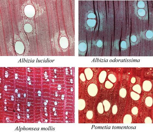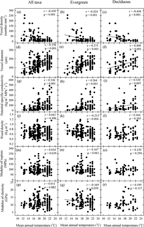 中国科学院昆明植物研究所的张石宝研究员联合广西大学、中科院西双版纳热带植物园的研究人员,利用树木的木材解剖学和力学数据、生长地点的气候因子,分析了云南省境内316种被子植物树木的木质部结构特征、潜在导水率及机械强度和气候因子的关系。结果表明,这些树种导管特征(导管密度、导管内径大小和潜在导水率)的差异远大于木材密度和力学特征,木质部的潜在导水率与机械强度不相关。导管内径大小和潜在导水率与样木生长地的年平均温度呈正相关,导管密度与年均温负相关。常绿树的导管密度与干旱指数正相关,其潜在导水率及抗压强度与干旱指数负相关,木材密度、抗压强度与年均温正相关。而落叶树则没有这些相关。年降水对树木的潜在导水效率和机械强度的影响小于年均温。结果说明,常绿树的木质部发育对环境的变化比落叶树敏感,导水效率与机械强度不存在权衡关系,后者可能是由于被子植物的木质部机械稳定性和导水功能相互独立的缘故。这些结果对于探讨森林生态系统服务与功能对环境变化的响应、以及常绿与落叶树对环境变化的响应有重要参考价值。