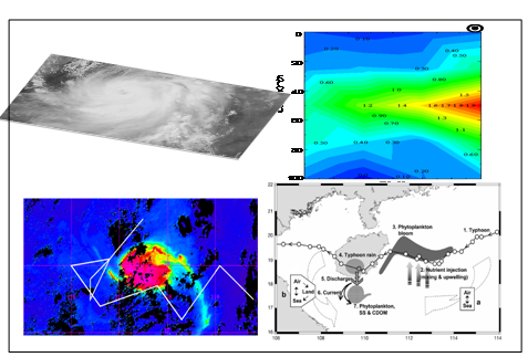 研究成果表明,台风可引起海洋表层浮游植物藻华,增加海洋初级生产力,同时台风还可引起次表层浮游植物水华,且次表层藻华的持续时间比表层水华持续时间更长。深入研究揭示,台风的强度、移动速度、台风位置、降雨等都是影响海洋藻华的重要因素,但台风引起的海洋上层混合和上升流将底层富含营养盐的海水输送至真光层是导致叶绿素水华出现的主要原因,而台风的当地逗留时间、回旋时间可增强海洋涡旋状藻华,这为认识台风对海洋生态系统影响提供新的信息。