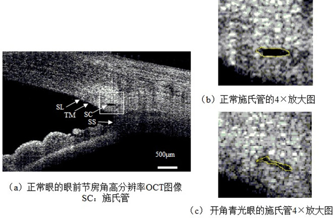 世界卫生组织预测,到2020年全球将有4.5亿开角青光眼(Primary open-angle glaucoma, POAG)患者,但是POAG的形成机制、发病机理尚不清晰,存在多种假说。目前普遍认为,房水循环受阻引起眼压升高是造成青光眼的最主要成因。施氏管作为房水循环的中间通道,房水汇集于此并注入房水静脉,从而形成房水循环。早在1970年,前苏联医学科学院的Nesterov教授推测,施氏管形态崩塌是房水受阻,并形成POAG的主要成因。学术界认为施氏管的管腔面积变化量,是POAG诊断、药物治疗与手术效果评价的重要依据。目前,临床普遍使用的光学活体成像技术分辨率较低,使得施氏管的形态研究仅局限在离体与动物眼球。