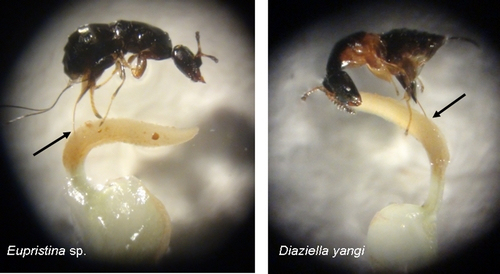 中科院西双版纳热带植物园协同进化组研究人员以钝叶榕为研究对象,对进果产卵的3种榕小蜂(Eupristina sp., Diaziella yangi, Lipothymus sp.)的生物学特征进行了深入的研究,解决了进果产卵的金小蜂是否像传粉小蜂一样为同步成熟的卵;是否与传粉榕小蜂一样有相同的产卵位点;是否倾向于在短花柱的雌花上产卵,及这些小蜂是造瘿者、寄居者还是复寄生者等四个问题。