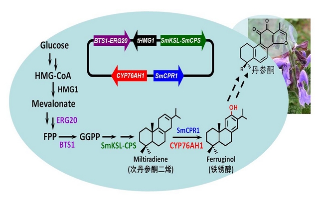 植物源萜类化合物具有广泛生物活性,但依赖植物体的传统生产方式是推广应用的瓶颈之一。采用合成生物学策略,创制微生物“细胞工厂”,有望为植物源萜类化合物低成本、可持续供给提供先进技术。丹参酮为我国传统中药丹参的主要脂溶性活性成分,属于松香烷类去甲二萜化合物。该研究组与中医科学院中药资源中心黄璐琦研究员课题组合作,前期构建了高产丹参酮合成前体次丹参酮二烯的酵母工程菌株(J. Am. Chem. Soc., 2012, 134(6): 3234)。