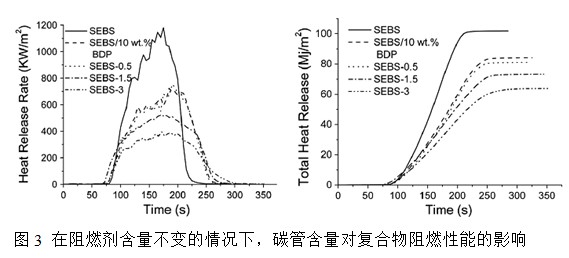 由于碳纳米管具有很大的比表面积和长径比,碳纳米管间存在着较强的范德瓦耳斯力和物理缠绕,使得碳纳米管在聚合物机体中的分散变得异常困难,从而限制了碳纳米管的应用,而碳纳米管的化学或物理改性为碳管的良好分散提供了一个有效途径。然而,包覆或接枝到碳管上的聚合物薄层又增加了碳管之间的电子跃迁势垒,阻碍了碳纳米管之间的电子跃迁,从而限制了复合物电性能的提高。而强极性纳米粒子的加入则有效的降低了因覆盖在碳纳米管上的聚合物薄层引起的碳纳米管之间的势垒,促进了碳纳米管之间的电子跃迁(见图1),从而在不增加碳管含量的条件下提高了复合物的电性能(见图2)。此外,该中心研究人员还发现碳纳米管与传统无卤阻燃剂在阻燃方面也存在协同效应(见图3)。