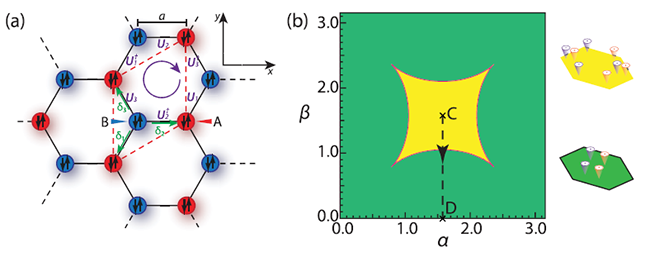 图1 (a) 具有非阿贝尔人工规范势的六角光晶格,其中红色点代表A子格,蓝色点代表B子格,上下箭头代表自旋自由度,U1 U2 U3 代表不同链上的人工规范势,δ1δ2δ3代表B子格到A子格的最近邻矢量;(b) 系统关于非阿贝尔磁通α和β的相图,其中黄色区域为具有八个狄拉克点的相,绿色区域为具有四个狄拉克点的相,中心点C对应π磁通的阿贝尔点,正方形四条边规范等价于规范平庸的阿贝尔点。从图2开始我们将注意力集中到中心点C到底边中点D的过程。