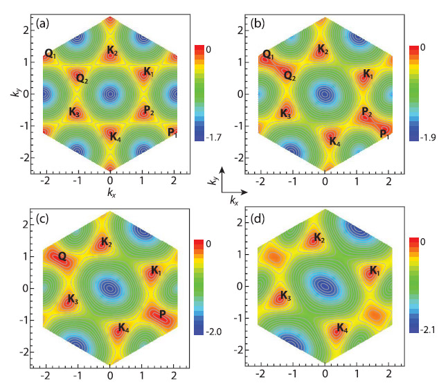 图2 对应图1虚线上不同点的费米面拓扑结构。相应的非阿贝尔磁通α和β分别为:(a) α=π/2,β=π/2; (b) α=π/2, β=2π/5; (c) α=π/2, β=π/3; (d) α=π/2, β=π/4。图中用K1 K2 K3 K4 Q1 Q2 P1 P2标出了狄拉克点的位置,其中 (a) 处于八个狄拉克点的相;(b) 处于八个狄拉克点的相;(c) 处于拓扑量子相变临界点,有两对狄拉克点碰到了一起;(d) 处于具有四个狄拉克点的相,之前碰撞的两对狄拉克点已经消失了。