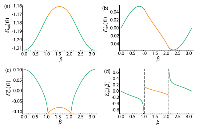 图3 基态能量密度关于非阿贝尔磁通β的函数及其各阶导数。(a) 基态能量密度随β变化;(b) 基态能量密度的一阶导数随β变化; (c) 基态能量密度的二阶导数随β变化;(d) 基态能量密度的三阶导数随β变化。