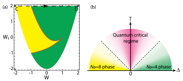 图4 (a) 系统随Wilson圈W和W1变化的相图,W和W1分别为费密子绕一个六角格子跑一圈和相邻的两圈所对应么正变换的迹,其中黄色区域为具有八个狄拉克点的相,绿色区域为具有四个狄拉克点的相。(b) 系统随温度T和磁通Δ的相图,其中两条虚线代表T~|Δ|的渡跃。 |