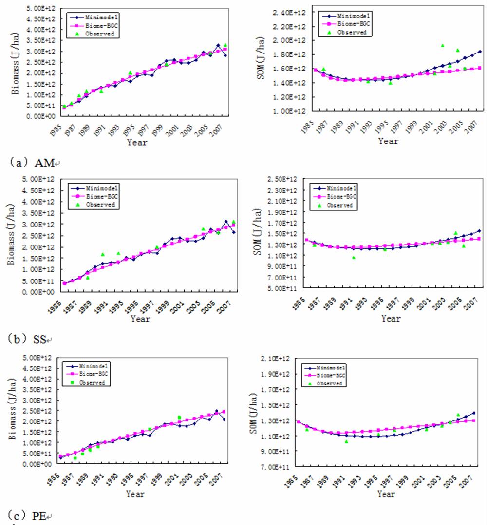 中科院华南植物园植被与景观生态学研究组的博士研究生李林军在导师任海研究员和陆宏芳研究员的指导下,借助Mini-model模型,模拟了南亚热带三种典型人工林生态系统(马占相思林、乡土混交林和针叶林)的生物量和土壤有机质等组分库和流在0-22龄间的动态变化和自组织发展过程;然后将生物量、土壤有机质模拟结果与前期开展的并已经过验证的Biome-BGC模拟结果以及历年实测数据进行了对比;结果发现,Mini-model模型模拟的结果与后两者保持一致,较好地模拟了三个人工林系统生物量和土壤有机质的动态变化。这说明只要将主要的生态系统组分、过程和驱动力因素考虑在内,Mini-model模型的模拟也能具有同基于生理生态过程的Biome-BGC模型模拟一样的效果,同时验证了系统的能量流动和转换过程特征同系统的物质生产与代谢行为相吻合。因此,Mini-model模型从宏观整体的系统视角出发,以最少的维度简化模拟具体的生态系统过程,较为简单和容易使用,是从能量动力学角度简化模拟复杂生态系统、探讨系统结构和功能特征及其发展变化很好的工具和手段。
