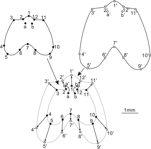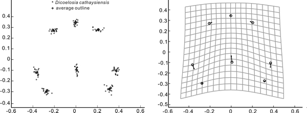 传统研究中,该腕足动物的壳体轮廓(主要表现在双叶的大小与形态)是其系统古生物研究的主要依据。而本研究在华南奥陶纪末大灭绝后新发现了该分子,但在壳体轮廓上存在较大程度的“变异”。为了认识这一形态变异的来源,本研究对其基本形态测量参数进行了主成份分析,得出该变异与体型大小的相关性,表明该“变异”主要来源于其个体发育过程,暗示奥陶纪末大灭绝后的复苏期生态环境已经好转。应用界点(Landmark)分析的结果不仅证实了该结论,其薄板样条曲线(Thin-plate splines)进一步展示了该分子双叶的形态主要由其中央凹陷(Emargination)的发育所控制(插图1),为该分子的系统古生物研究提供了新认识。本研究还首次使用区域变形(Field Morphing)这一新技术(原理见插图2),动态模拟了该腕足的个体发育过程(动画1),也为相关的古生物研究提供了新的手段。