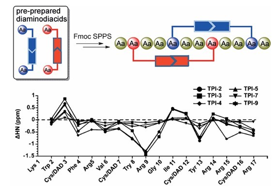 相关研究结果于6月26日以Diaminodiacid-Based Solid-Phase Synthesis of Peptide Disulfide Bond Mimics(基于双氨基酸的二硫键替代后多肽固相合成)为题在线发表在Angewandte Chemie International Edition (《德国应用化学》)杂志上(doi: 10.1002/ anie.201302197),中国科学技术大学生命学院的博士研究生何垚,清华大学的博士后崔洪奎、郭烨是文章的共同第一作者,中科院强磁场科学中心的吴芳明博士也参加了该项研究工作。