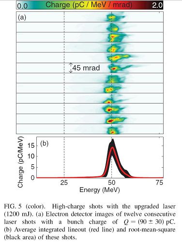 对于电子束的潜在应用(例如基于波荡器的自由电子激光),电子束单位能量内的电量是一个极为重要的物理参数。在本实验中,电子束电量最大可达到100pC同时电子束能散度低,因此单位能量内的电量大大提高。尽管目前电子束的能量受到实验装置的限制,为150-200MeV。但是,若用同样的方式,极有希望产生数百MeV的且相对能散度小于1%的高能相对论电子束。