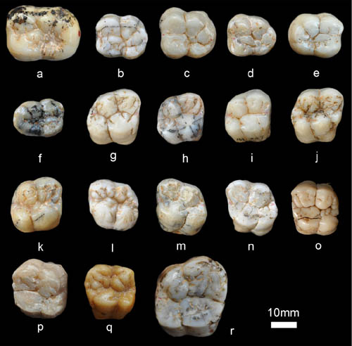 该研究发现,巨猿的实测釉质厚度是目前所有已知现生和化石灵长类中最厚的,只有非洲粗壮的傍人、希腊的奥兰诺古猿以及南非早期人属成员与之接近。牙齿的相对釉质厚度指数考虑到了牙齿与身体大小的关联因素,研究结果显示巨猿的相对釉质厚度却低于傍人、奥兰诺古猿及南非早期人属,表明在相同的体型大小条件下,巨猿的牙齿釉质并不是最厚的。哪些现生和化石灵长类相对釉质厚度与巨猿接近呢?某些中新世古猿、南方古猿、东非早期人属、亚洲直立人以及现代人,甚至现生卷尾猴的相对釉质厚度指数与巨猿相近。