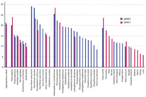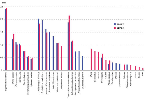 图5巨猿与其他现生及化石灵长类牙齿相对釉质厚度比较(张立召供图)