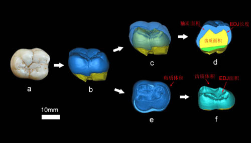 图2 巨猿牙齿二维与三维釉质厚度的测量(张立召供图)