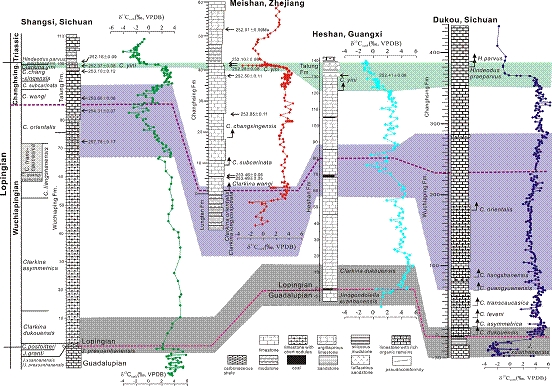 中国科学院南京地质古生物研究所沈树忠研究员等通过华南和伊朗等地的一系列贯穿整个乐平统的剖面的详细研究,表明二叠纪晚期的碳同位素变化在瓜达鲁普世末期、吴家坪期晚期以及二叠纪最末期均有记录,但只有二叠纪最末期的碳同位素变化在时间上分布稳定,而瓜达鲁普世末期和长兴期/吴家坪期之交的大规模同位素变化在时空上有较大变化,因此,其解释需要重新考虑。这些同位素地球化学变化为特提斯大区的高精度对比和当时地表环境背景提供了重要的依据。