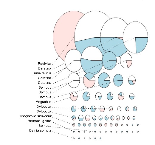 一种新的多基因数据集的物种聚类方法在北京蜜蜂序列的数据集上的应用。每一个扇形图是一个单独的物种单元,其大小与序列组成的物种单元的数量成比例。颜色代表基因片段,蓝色=CytB,白色=COI,红色=28S。结果显示共有70个物种单元。