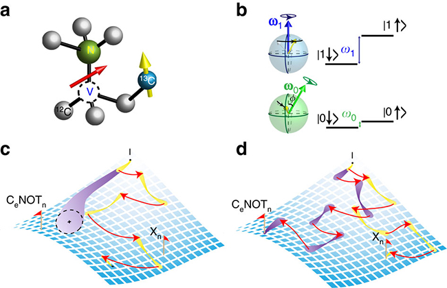 金刚石中的氮-空位中心(Nitrogen-Vacancy center)是实现量子计算的优良载体。在纯净的金刚石中,一个氮原子取代碳原子,与相邻格点中存在的空位(见图1)会形成氮-空位中心。氮-空位中心具有如下特征:(1)在室温下具有很长的电子自旋退相干时间;(2)用激光激发、微波操控和荧光读出可以实现量子态的高保真度制备、操控及读取;(3) 与周围核自旋形成丰富的超精细相互作用环境。这些独特的性质使得氮-空位中心在量子计算、高空间分辨率的弱磁探测(单分子NMR)和温度探测等方面拥有巨大的应用价值。