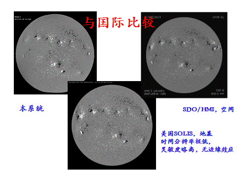 “太阳磁场望远镜系统”是中国气象局气象监测与灾害预警工程中一个重要系统,采用14cm口径望远镜开展太阳全日面光球矢量磁场测量,为空间灾害天气的监测预警服务。下图右上为本项目获得的纵向磁场资料,右上为目前最先进空间设备SDO资料、下图为美国地基设备SOLIS资料,经过对三组资料的空间分辨率、磁场灵敏度、观测效率、全日面均匀性等指标的综合比较后看出,三台设备各有优势,综合水平相当。