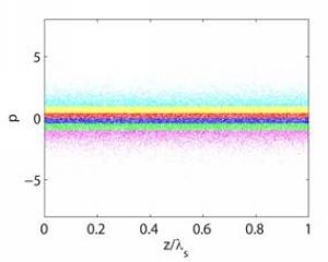 Cooled-HGHG机制电子束相空间演化过程示意图:不同颜色代表不同能量电子,可见在一个种子激光波长范围内,中间部分电子束能散得到了压缩。