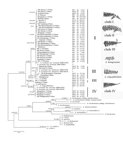 基于最大似然法分析倒挂铁角蕨复合体的叶绿体DNA序列得到的系统树