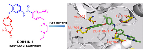 目前,人们对于DDR1在癌症病理过程中所发挥的具体作用的认知还非常有限,选择性抑制剂DDR1-IN-1的发现为进一步揭示DDR1激酶在人体内的生理和病理功能,及验证DDR1是否可以作为抗癌症药物开发的靶点奠定了基础。
