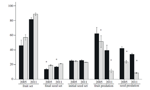 中科院湿地生态学学科组以大王马先蒿(Pedicularis rex)为材料,通过两年的研究,揭示了植株密度对大王马先蒿的传粉成功、生殖成功以及种子被啃食程度的影响。结果表明,两年中密度对大王马先蒿的受粉率、种子被啃食前的坐果率和结实率均没有影响。然而,自然条件下大王马先蒿的种子被啃食的情况很严重,并且稀疏斑块中的植株种子被啃食的频率显著高于密集斑块;其结果就导致稀疏斑块中植株的最终的结实率显著降低。研究揭示出大王马先蒿居群不存在传粉者介导的阿利效应,但确实存在种子啃食者介导的阿利效应发生;该研究为植物中同样存在捕食作用介导的阿利效应提供了一个有力的证据。