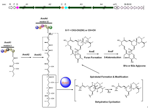 阿维菌素(Avermectins,AVEs)是一类产生于除虫链霉菌、包含8个天然组分的16元大环内酯类抗生素。具有相似骨架的抗生素还包括米尔倍霉素(Milbemycins,MILs)、梅岭霉素(Meilingmycins,MEIs)和奈马克丁(Nemadectins,NEMs),结构上均拥有一个与大环内酯偶联的特征性6,6-螺环单元。这类天然产物的发现,是抗虫药物发展历史上的一个重要里程碑。阿维菌素的生物合成研究始于20年前,虽然有大量研究,但是关于其特征性的6,6-螺环单元合成的分子机制一直不清楚,这一基础科学问题也长期困扰了工业用阿维菌素生产菌株的生物技术改造,如何简化组分构成、提高有效成分的比例缺乏可信赖的理论依据。