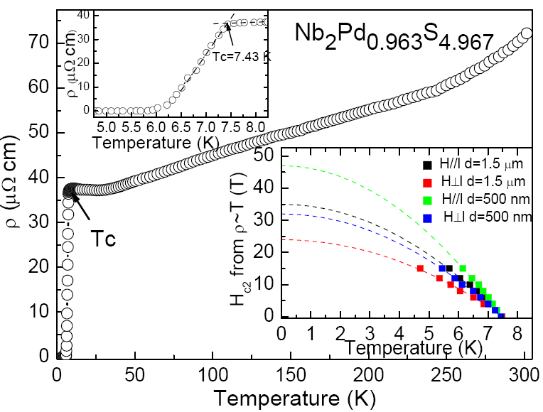 该研究小组通过在原始化学配比中调节Nb,Pd和S的不同组分,并适当在高温反应中调节反应温度和降温的方式,获得了大量具有相似纤维状形貌的Nb2PdxS5-y (0.6<x<1;0<y<0.61)样品。非常有意思的是,在其高的Pd位和S位缺陷浓度下,样品仍具有良好的超导转变,表明体系的超导电性非常强壮。
