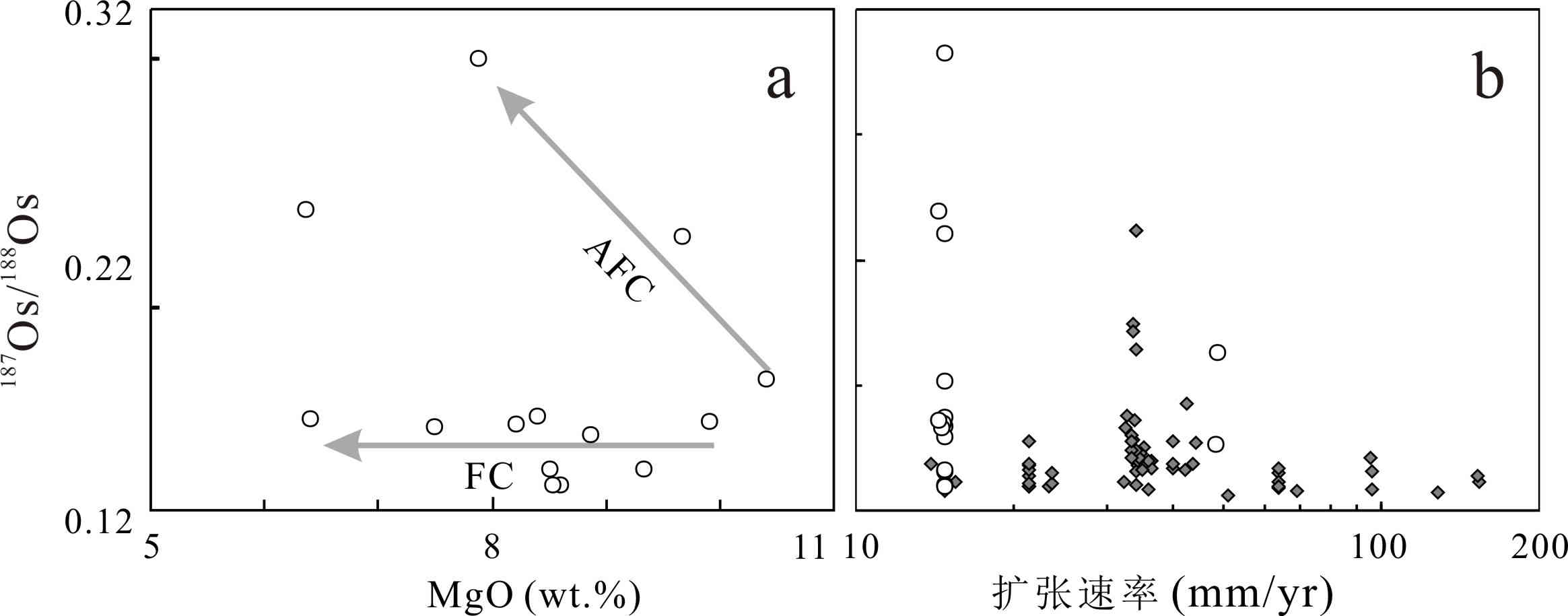 图a. 西南印度洋脊187Os/188Os比值与MgO含量相关关系图。图b. 全球N-MORB的187Os/188Os比值与扩张速率相关关系图。AFC:同化混染和结晶分异;FC:结晶分异。圆圈为本研究数据,其他为文献数据。