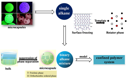 研究人员选择长链正烷烃作为高分子结晶的模型化合物,并构筑一种均一的微胶囊三维受限环境,研究了单组份和双组份混合正烷烃在微胶囊中的受限结晶行为,发现受限环境中正烷烃的表面结晶现象增强,旋转亚稳相的稳定性增加(J. Phys. Chem. B 2006, 110, 14279-14282; J. Phys. Chem. B 2008, 112, 13310-13315; J. Phys. Chem. B 2008, 112, 16485-16489; Phys. Chem. Chem. Phys. 2011, 13, 2021-2026; Phys. Chem. Chem. Phys. 2011, 13, 15031-15036)。通过调节组分碳数差别、组分含量和受限环境,可以调控混合正烷烃相分离(J. Phys. Chem. B 2009, 113, 3269-3272; J. Phys. Chem. B 2011, 115, 4632-4638; J. Phys. Chem. B 2012, 116, 3099-3105)。在此基础上,开展了受限环境中高分子的结晶行为研究,初步揭示了聚氧乙烯在多孔阳极氧化铝模板中结晶时分子链的取向和片晶排列规律,发现聚氧乙烯链段在10 nm的孔中以平行于纳米孔的方向进行取向(ACS Macro Letters 2013, 2, 181-184)。