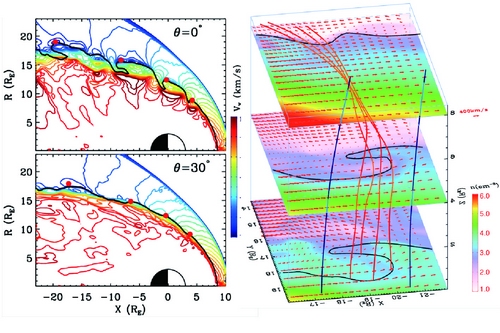 该项研究成果首次成功获得磁层顶K-H波动的全球特性。研究表明,受流场和磁场全球形态的控制,最大的波动振幅分布于晨昏两翼;对于向磁尾对流传播的K-H波动,中纬度波动的相位在向阳面领先于低纬的相位,在背阳面则落后于低纬度的相位;转折点发生在晨昏两翼区域。此外,研究组还发现,波动相位从向阳面到背阳面的演化过程是一全球特征的表征,即K-H表面波/涡旋的轴与地球磁层磁场相联。