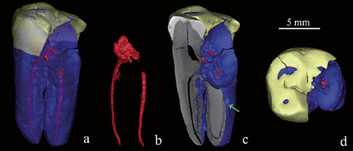 图2 智人II号标本CT扫描3D复原图像,a、b中红色示断裂的齿槽管;c为冠状面切片示,牙骨质增生部位内部结构;d为咬合面观,示牙齿磨耗程度。(吴秀杰供图)