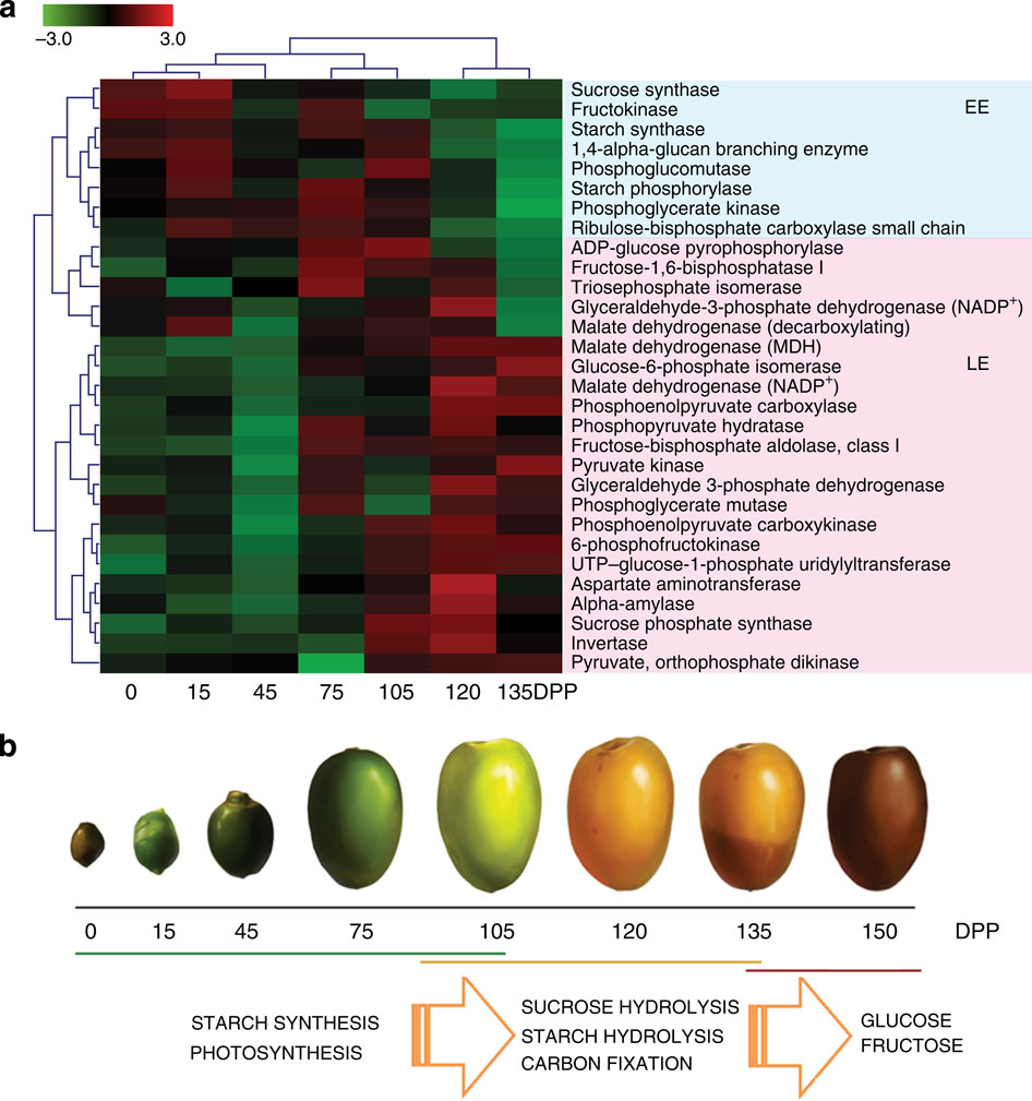 利用大量的转录组数据,科研人员阐明了枣椰果实的发育和成熟时期独特的糖代谢变化。这种大规模基因组和转录组数据为进一步的椰枣基因组研究和其它棕榈科植物的研究奠定了基础。此外,该研究还获得了第一个棕榈科植物—枣椰的叶绿体基因组序列,有助于了解棕榈科叶绿体基因组的结构特点,以及进化过程中基因组变异情况。