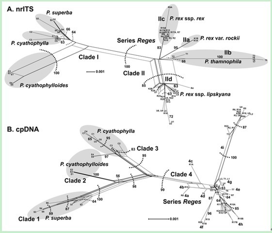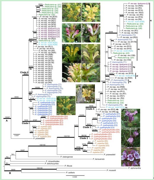 中国科学院昆明植物研究所生物多样性与生物地理学重点实验室郁文彬博士,在李德铢研究员和王红研究员的共同指导下,该研究通过较高密度的取样,基于核基因ITS和四个叶绿体片段联合数据,运用贝叶斯推论(BI)、最大简约法(MP)和最大似然法(ML)重建斗叶组的系统发育关系,并利用SplitsTree进行网状进化分析。研究表明,核基因ITS构建的系统树和网状结构图与传统分类具有较高的一致性;叶绿体联合分析显示四川分布的拟斗叶马先蒿(P. cyathophyllodies)两个居群的叶绿体基因组可能是从斗叶马先蒿(P. cyathophylla)的祖先中捕获而来。斗叶组中的大王系(series Reges)的系统关系极为复杂,推测可能是因不完全的谱系筛选、杂交或基因渐渗透所造成。在斗叶组中,无喙型和有喙型花冠是独立演化,而长管有喙型是由短管花冠演化而来。该研究较为准确地构建了斗叶组种间的系统演化关系,为进一步深入开展斗叶组,尤其是大王系的物种形成机制和生物地理学打下了坚实的基础。