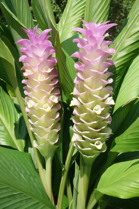 “紫玉美序郁金”(Curcuma petiolata ‘Ziyu’) 是2007年从泰国Kasetsart大学园艺学院引进,经分球繁殖和驯化选育而成。该品种在全光照下栽培,平均株高56.7厘米,地下主根茎圆球形,直径3.3厘米。叶基生,长椭圆形、革质、草绿色。穗状花序,淡紫色,顶生,长76厘米,宽20.3厘米;着花部分长49厘米, 花序梗直立坚挺,长30.5厘米,直径0.8厘米;具苞片55.2枚,莲座状排列,阔卵形, 上部苞片紫红色,中下部苞片颜色渐淡,蜂窝状排列。小花生于苞片腋部,白色,唇瓣先端黄色。花期夏、秋季。地栽单花序观赏期可超过30天,切花瓶插寿命约15天。