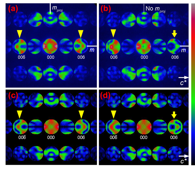 图2 在(a)室温和(b) 90 K 时沿 LiOsO3 [120] 区间轴的CEBD图谱。(c)和 (d) 对应利用中心对称模型(R-3c) 和 (d) 非中心对称模型(R3c)拟合结果。箭头或箭状图形表示沿倒易空间c* 方向中心对称在晶体结构中存在或消失的情况,反映了中心反演对称性的破缺。