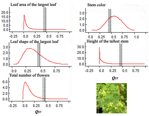 自然选择以及遗传漂变是决定植物居群的遗传与表型分化的重要进化力量。在一些常见的动植物中,自然选择(selection)以及遗传漂变(genetic drift)如何影响物种的适应性表型性状分化的研究已有大量的报道,然而对于片断化分布的濒危物种而言,小且相互隔离的居群的数量性状如何响应自然选择以及遗传漂变目前还知之甚少。中科院武汉植物园姚小洪副研究员和叶其刚副研究员合作,以分布于长江三峡的中国特有濒危植物裸芸香为研究对象,通过比较裸芸香残存居群基于分子标记的居群遗传分化以及5个数量性状的遗传分化,来阐明选择以及漂变如何影响濒危植物数量性状的遗传分化。