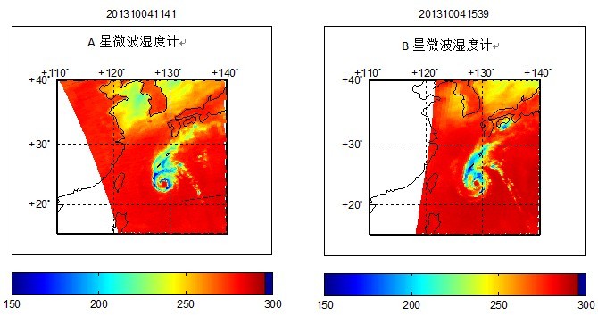 图二:2013年10月4日:FY-3A、B星微波湿度计探测“菲特”台风